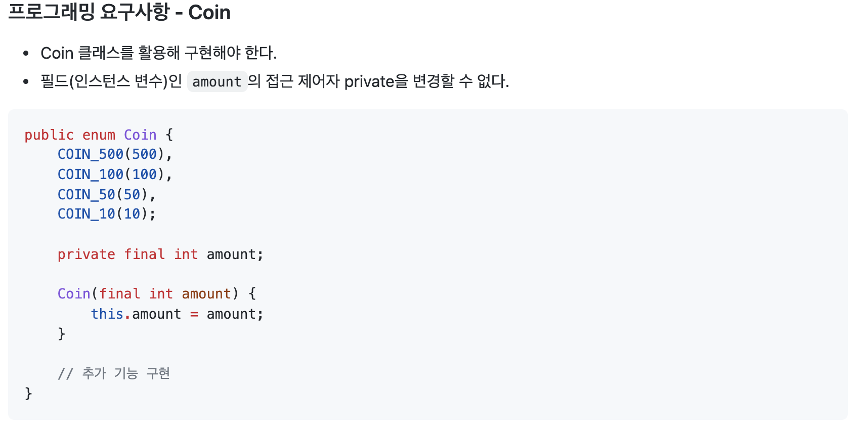 하지만 Coin Enum 클래스를 사용함으로써 Coin의 타입을 아무 int 형 값이 아닌 [500, 100, 50, 10] 으로 제한할 수 있고,