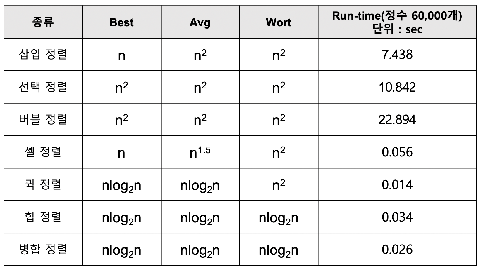 정렬 알고리즘 시간 복잡도 비교